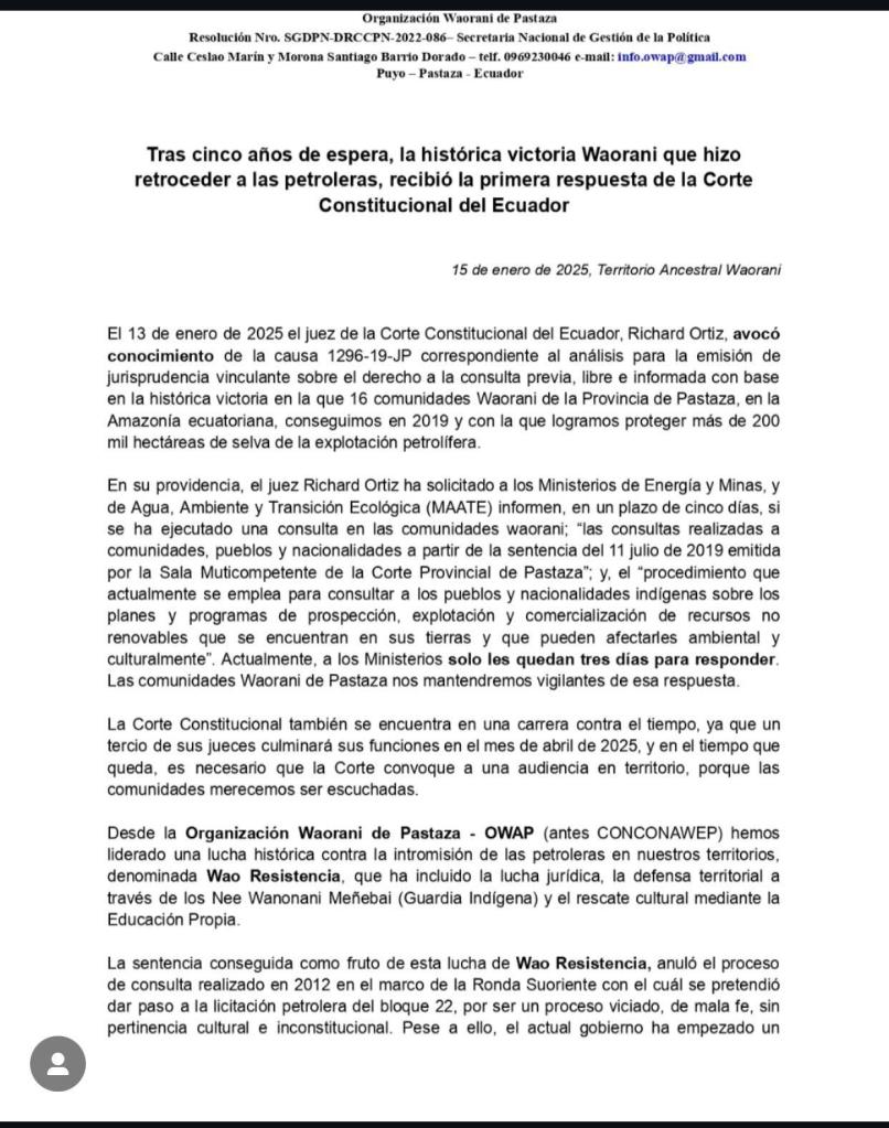 In a recently published communiqué the organisation of the Waorani people in the province of Pastaza (OWAP) provided a follow-up to a landmark case they had won in 2019 in the Pastaza Provincial court. The allegations against the Ecuadorian government offering land for oil drilling without proper free, prior and informed consultation had been ruled in favor of the Waorani people. Oil projects affecting 16 comunidades (village communities) on more than 200 million hectares of their land were stopped and precedent for informed consent and indigenous participation was set. However, until now no such consultations have taken place which is why the OWAP communiqué reminded the ministeries in charge of their duty. They also described the Waorani people’s on-going resistance against oil companies operating in their territory. Resistance, according to OWAP, is based on three pillars: legal fights, territorial defense through the Nee Waonani Meñebai as indigenous guards and promotion of culture through their own education. The Meñebai is a figure envisioned as half-jaguar and half-man which is also found on signposts in the territory. The communiqué shows the jaguar as an important element of Waorani cosmovision and reminds us of thinking defiance as a transculturation process.